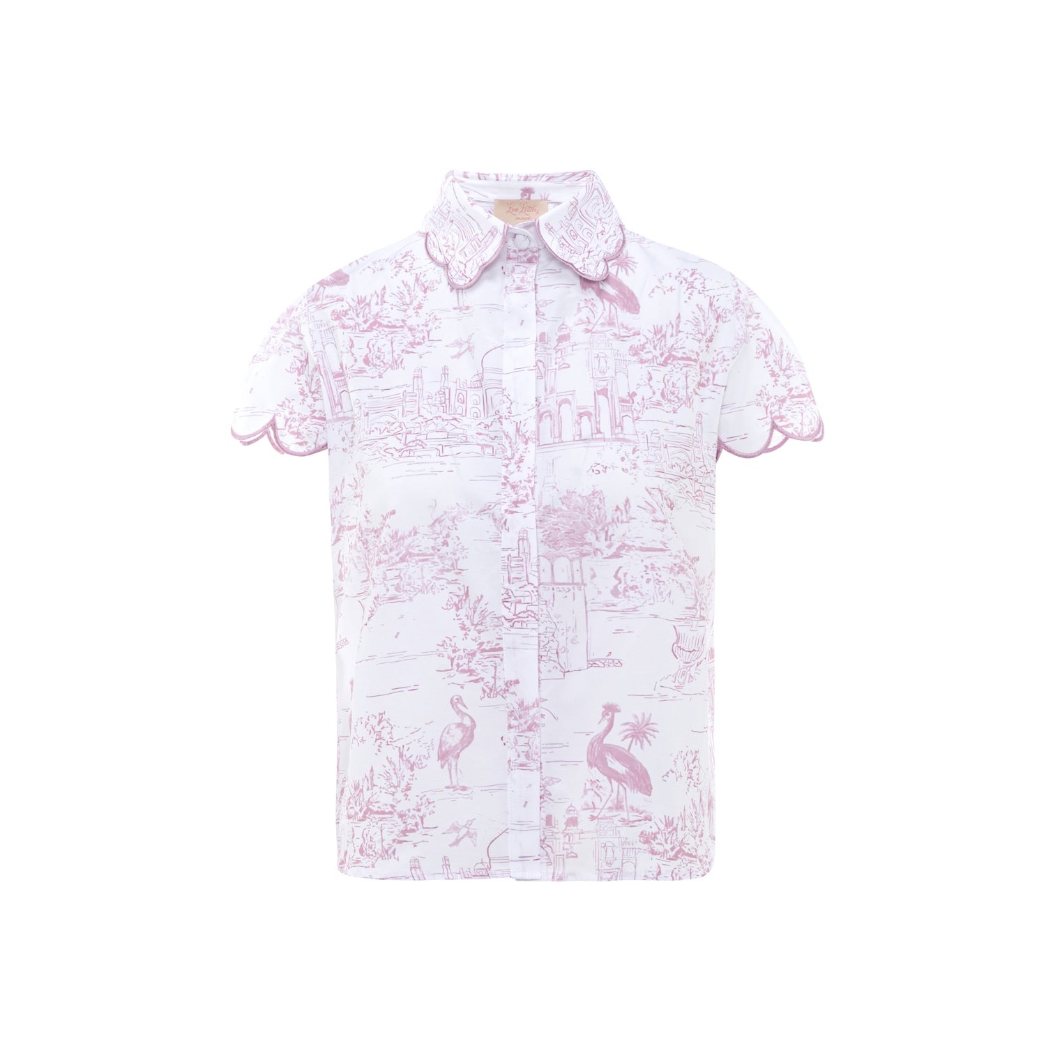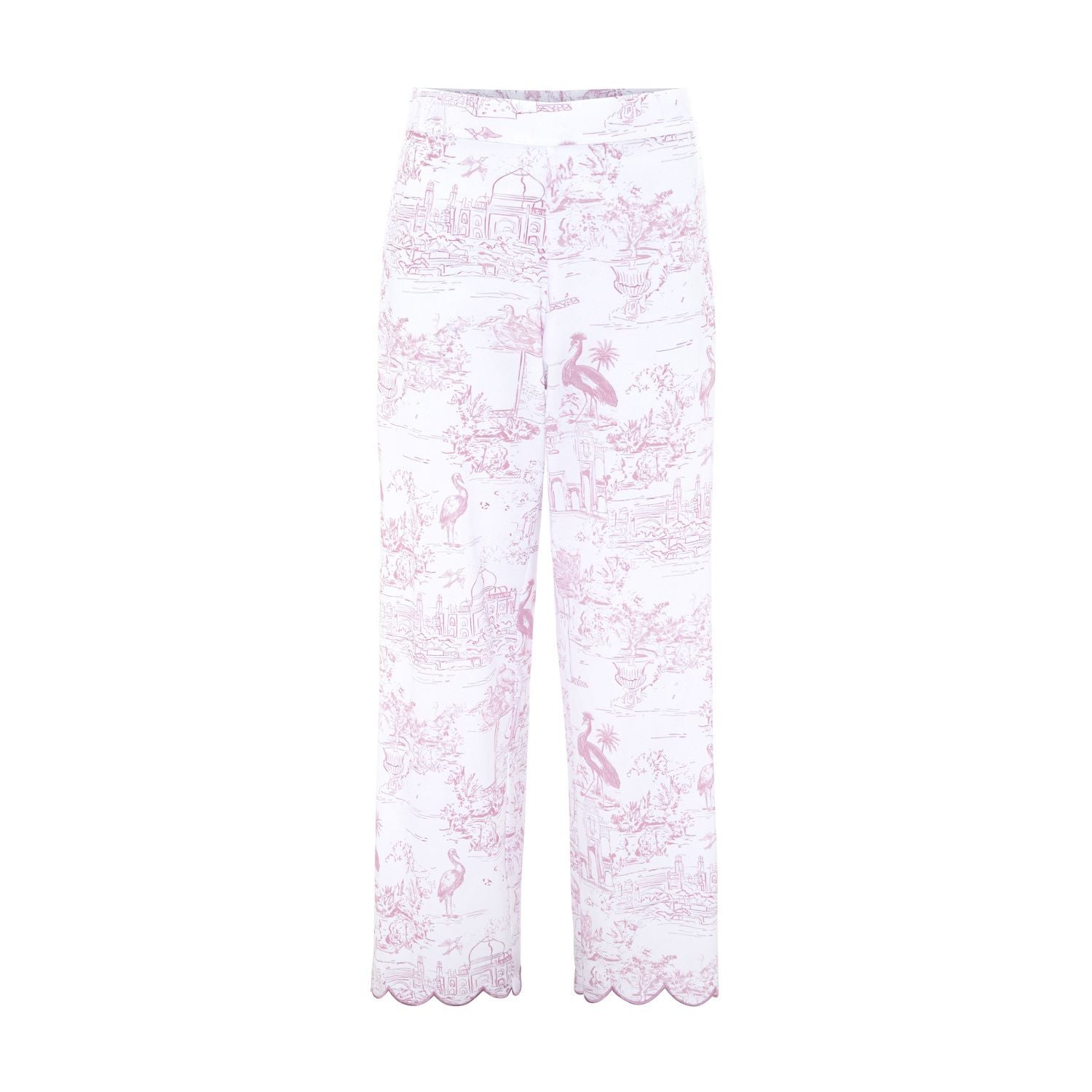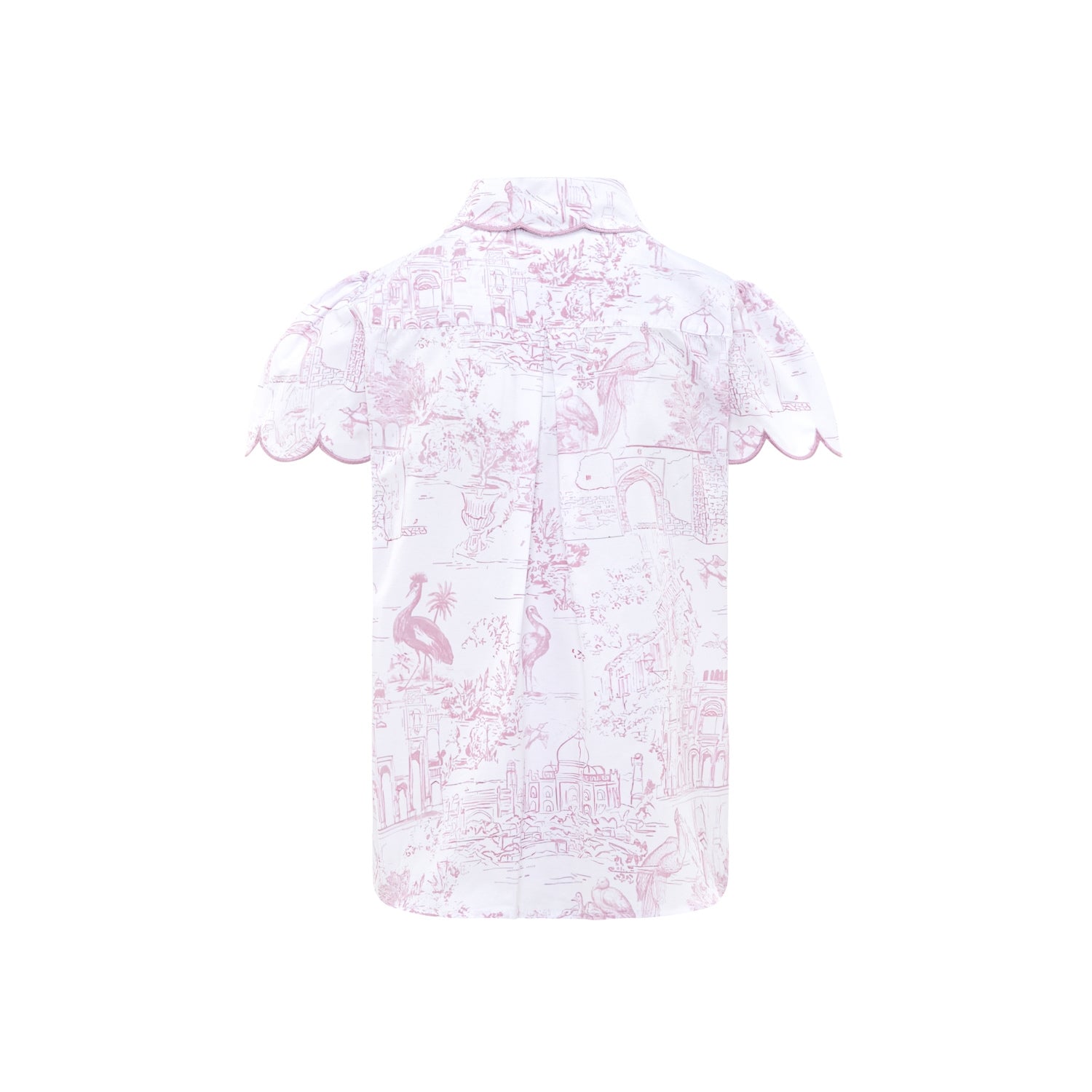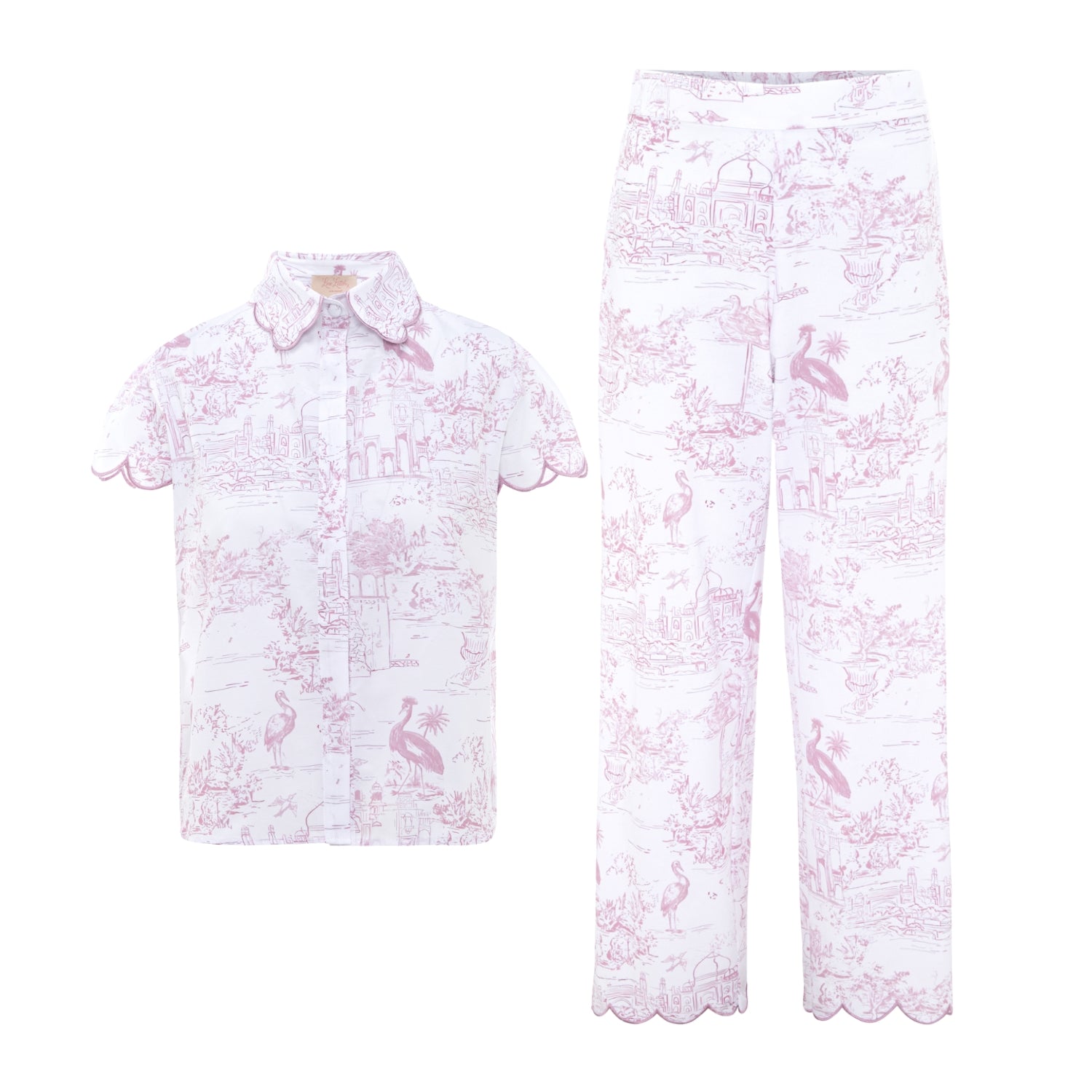 A timeless favourite returns in a softer lilac-pink hue and a slightly larger hand-drawn print inspired by Jaipur’s Pink City. The Pink Toile Cap Sleeve Long Pyjama Set captures the romance of slow mornings and soft light. Crafted in 100% organic cotton (exclusive of trim), it features a tailored short-sleeve button shirt with a scalloped collar and cuffs, paired with relaxed wide-leg trousers finished with matching scalloped hems — a delicate detail inspired by the arches of Jaipur’s palaces.