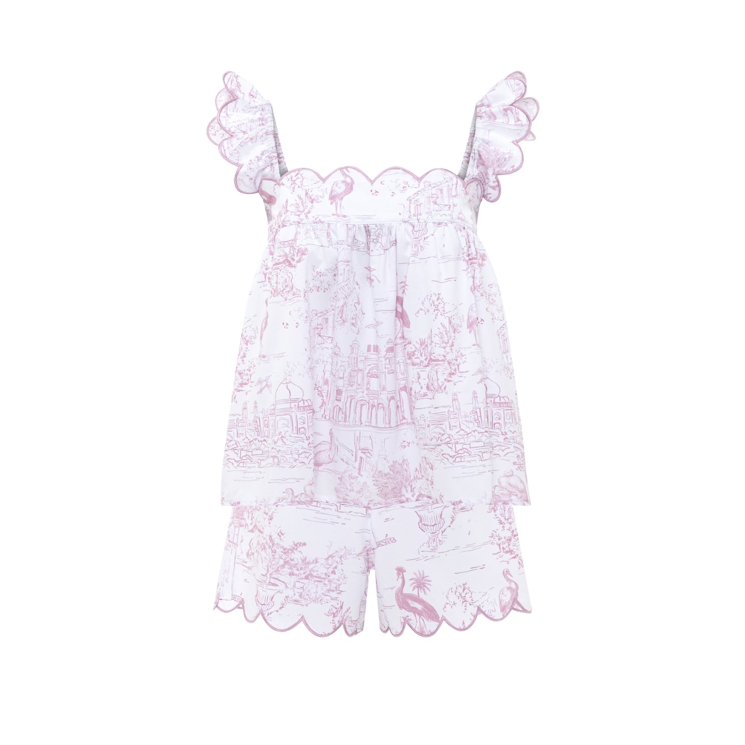 Fall asleep in romance. The Pink Toile Babydoll Short Pyjama Set is crafted from 100% organic cotton and adorned with our exclusive pink Jaipur Toile print, a love letter to the Pink City. Featuring delicate embroidered scalloped edges inspired by Jaipur’s palace arches, this dreamy duo brings vintage elegance to your nights (and mornings).