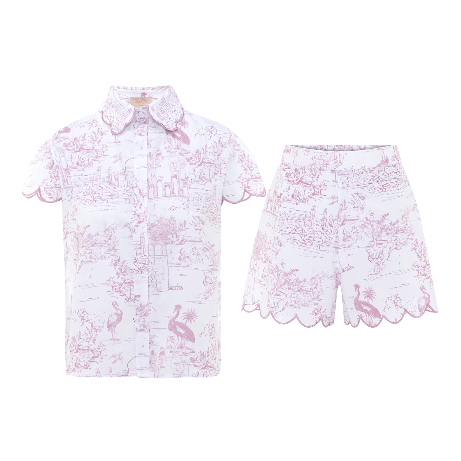 Sleep beautifully in the Pink Toile Cap Sleeve Short Pyjama Set, crafted from 100% organic cotton (exclusive of trim) in a soft lilac-pink hue. Featuring our exclusive Jaipur Toile print, this elegant set includes a button-up cap sleeve shirt with scalloped edges and matching shorts with a scalloped hem, inspired by the arches of Jaipur’s Pink City. Light, breathable, and effortlessly romantic, it’s made for warm nights and slow, love-filled mornings.